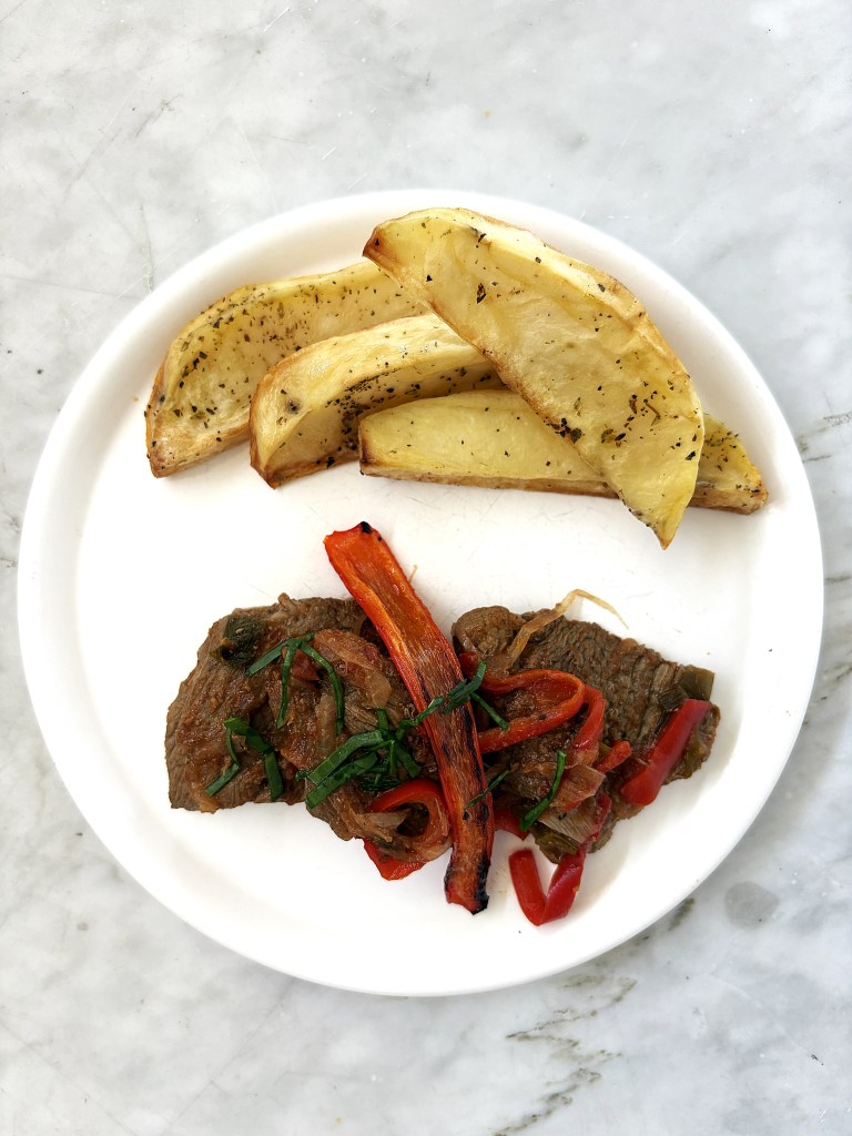Bifectos a la criolla con papas cuña. Ingredientes: Carne vacuna, morrón, cebolla, tomate, zanahoria, vino blanco, papas, condimentos. Información nutricional por vianda: kcal 320, carbohidratos 21 gr, proteínas 35 gr, grasas 9 gr