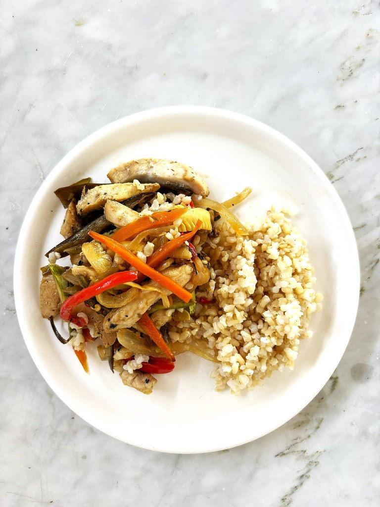 Chop suey de pollo Ingredientes: Pechugas de pollo, morrón, cebolla, zanahoria, berenjenas, zapallitos, arroz yamani, salsa de soja, condimentos. Información nutricional por vianda: kcal 382, carbohidratos 31 gr, proteínas 31 gr, grasas 8 gr