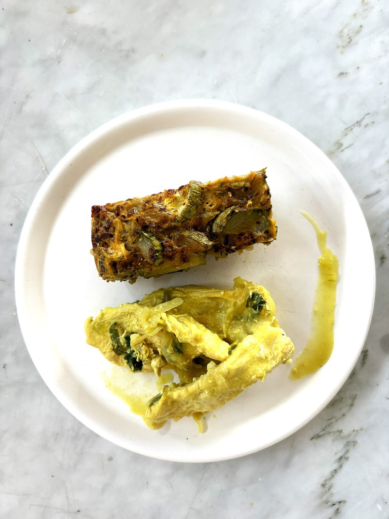 Pollo al curry con budin de zapallitos Ingredientes: pechuga de pollo, cebolla, queso crema, zapallitos, huevo, curry, condimentos. Información nutricional por vianda: kcal 320, carbohidratos 9 gr, proteínas 45 gr, grasas 6 gr