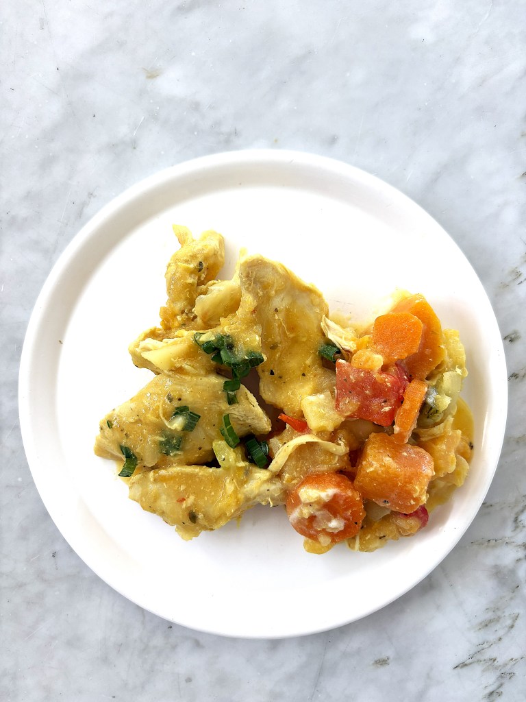 Pollo al disco Ingredientes: pechuga de pollo, morrón, cebolla, verdeo, zanahoria, batata, papa, queso crema, condimentos. Información nutricional por vianda: kcal 350, carbohidratos 20 gr, proteínas 38 gr, grasas 7 gr