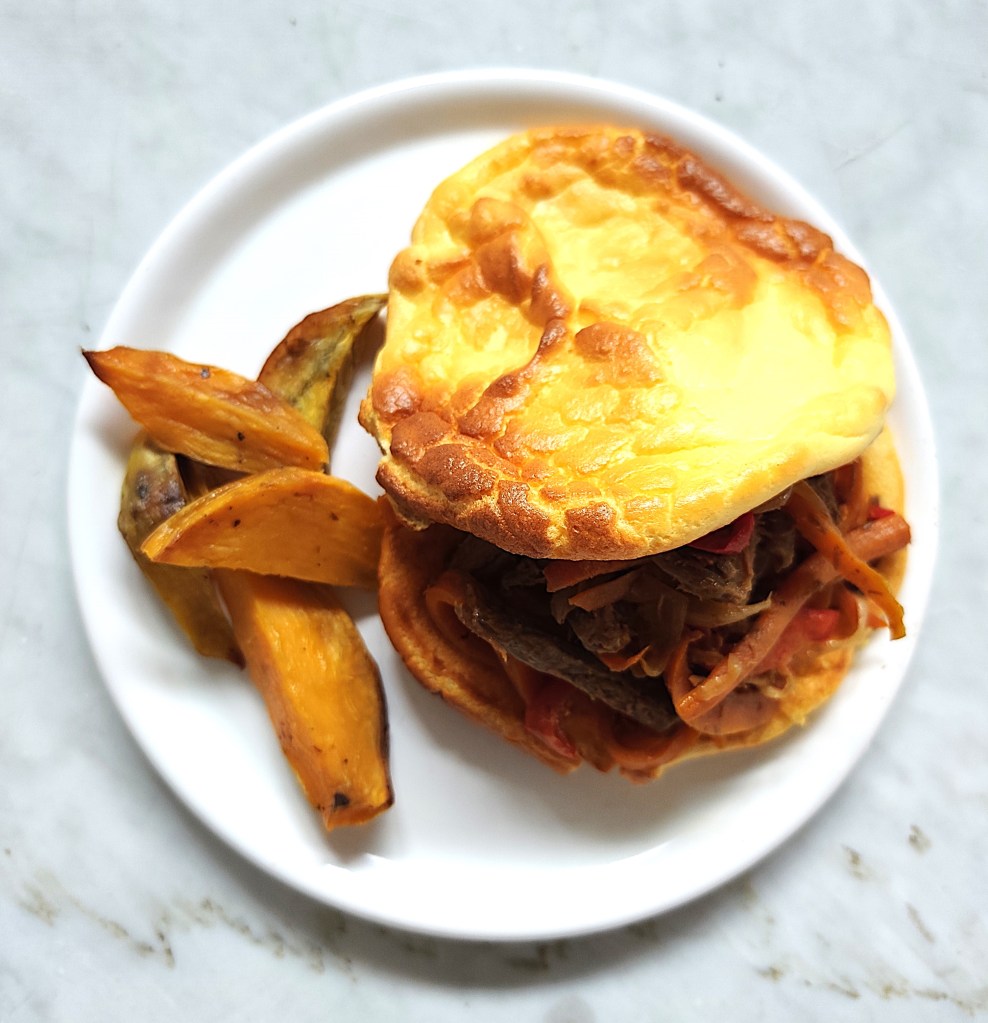 Sandwich de carne desmenuzada en pan nube Ingredientes: Carne vacuna, morrón, cebolla, verdeo, zanahoria, queso crema, huevo, condimentos. Información nutricional por vianda: kcal 350, carbohidratos 13 gr, proteínas 40 gr, grasas 12 gr