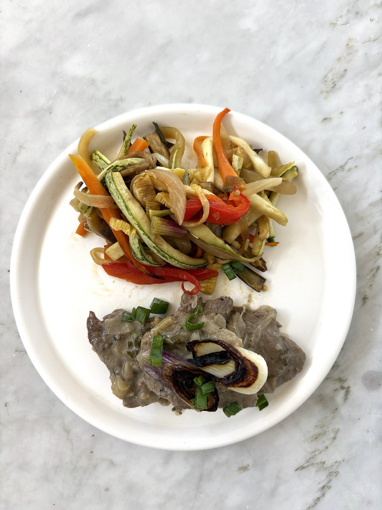 Ternerita al verdeo con vegetales al wok. Ingredientes: Carne vacuna, morrón, cebolla, zapallo cabutia, condimentos. Información nutricional por vianda: kcal 384, carbohidratos 14 gr, proteínas 30 gr, grasas 10 gr